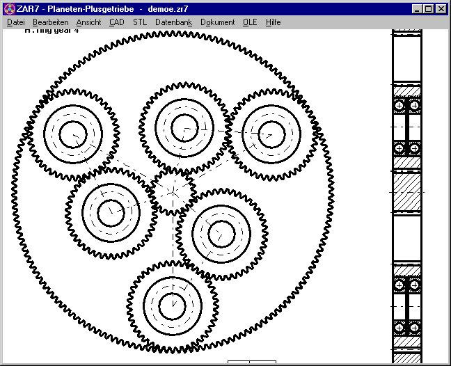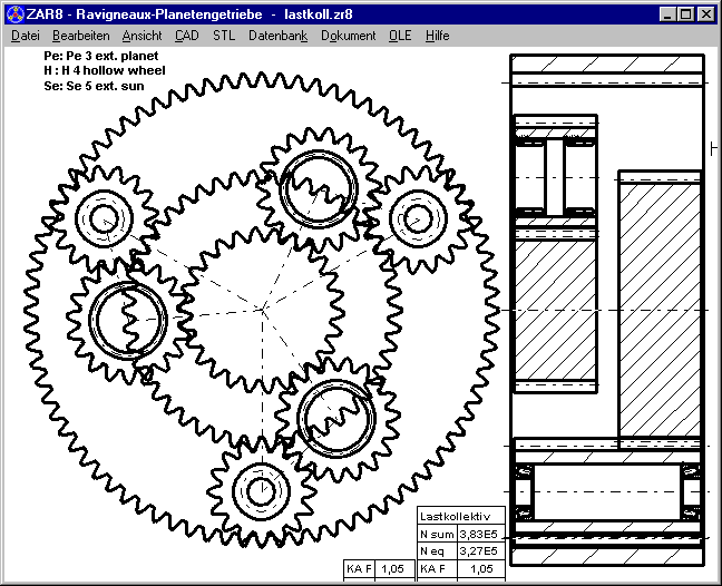 Abmessungen und Festigkeit der 4 Zahnräder S (Sonnenrad), Pi (inneres Planetenrad), Pe (äußeres Planetenrad) und H (Hohlrad) berechnet ZAR7 in einem Durchlauf. Die Wälzlager für innere und äußere Planetenräder kann man aus den mitgelieferten Datenbanken wählen und mit berechnen.