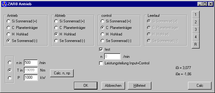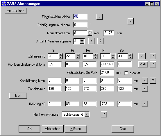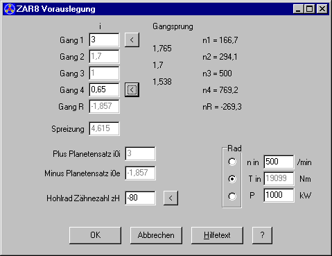 In der Vorauslegung kann man die Übersetzung von erstem und viertem Gang eingeben, daraus ergeben sich die Übersetzungen der Gänge 2, 3 und Rückwärtsgang. Auch die Standübersetzung und damit das Zähnezahlverhältnis der beiden Planetenstufen ist damit schon festgelegt: Standübersetzung i0i der Plus-Planetenstufe ist die des ersten Gangs, und i0e der Minus-Planetenstufe ist die des Rückwärtsgangs. Dann noch Eingangsleistung (oder Eingangsdrehmoment) und Eingangsdrehzahl sowie die Zähnezahl zH des Hohlrads eingeben, und ZAR8 berechnet Zähnezahlen und Abmessungen aller Zahnräder unter Beachtung der Montierbarkeitsbedingungen.