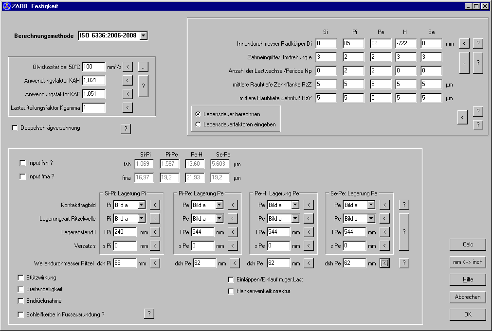 Die Eingabedaten für die Festigkeitsberechnung nach ISO 6336 wurden in einem großen Dialogfenster zusammengefaßt.