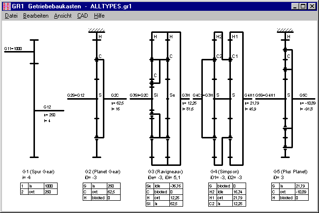 Mit GR1 kann man mehrstufige Getriebe "bauen" aus Stirnradstufen, Planetenstufen, Plus-Planetenstufen, Ravigneaux-Satz und Simpson-Satz. Dafür muß man für jedes Getriebeglied angeben, ob es als Antrieb, Abtrieb, Kontrollglied oder leer laufen soll. Bei Antriebsgliedern kann man entweder eine Drehzahl eingeben oder ein Getriebeglied einer Vorgängerstufe wählen. Kontrollglieder können entweder geblockt sein, oder man gibt eine Drehzahl ein für einen weiteren Antrieb.
