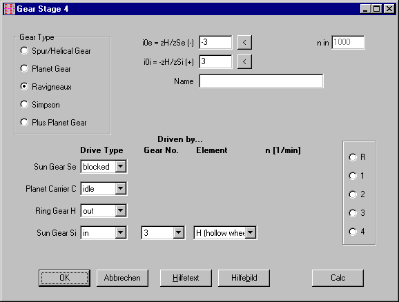 Die 4 Anschlusswellen Si, C, H, Se können Antriebswelle, Abtriebswelle, Kontrollglied oder Leerlaufwelle sein. Mittels der Knöpfe 1,2,3,4,R kann man auch die Standardgänge des Ravigneaux-Getriebes "durchschalten".