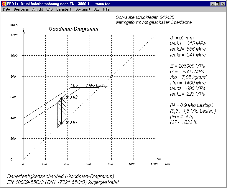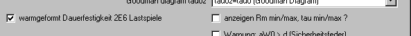 Die Dauerfestigkeitsschaubilder für warmgeformte Federn gelten nur für Federn nach EN 10089 mit geschliffener oder geschälter Oberfläche. Deshalb muß unter "Bearbeiten->Herstellung" "warmgeformt, Stahl mit bearbeiteter Oberfläche" und unter Bearbeiten->Werkstoff->Oberfläche "geschliffen" oder "geschält" gewählt sein, sonst wird kein Goodman-Diagramm gezeichnet. Statt 3 Kurven für 10 Mio., 1 Mio. und 100.000 Lastspielen enthält das Goodman-Diagramm für warmgeformte Federn nur 2 Kurven: für 2 Millionen Lastspiele und für 100.000 Lastspiele.