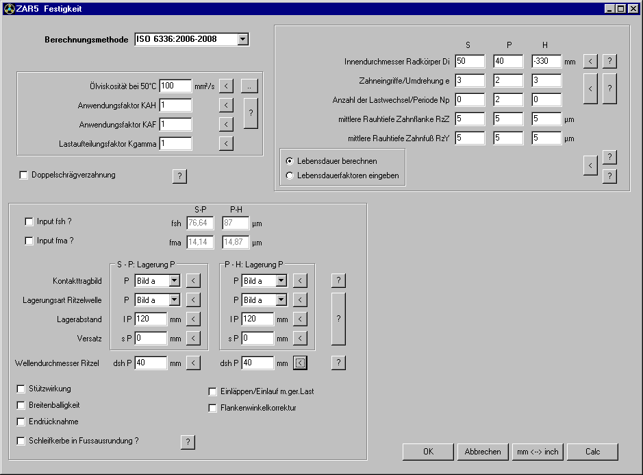 ZAR1+, ZAR5: Dialogfenster Festigkeitsberechnung