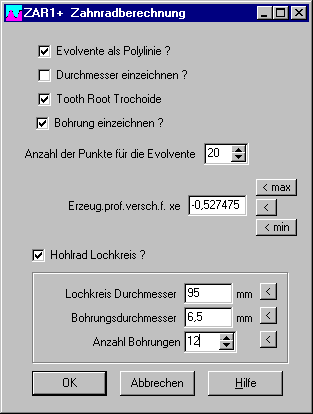 Bei den Abmessungen kann man noch Änderungen vornehmen, etwa bei Profilverschiebung, Kopfkürzung, Zahnradbreite.