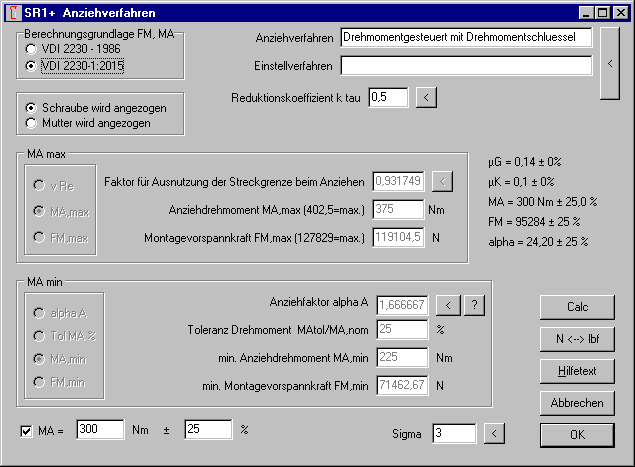 Anstelle der Grenz-Anziehdrehmomente MA,max und MA,min bzw. nueRp und alphaA kann man jetzt auch das nominale Anziehdrehmoment +/- Toleranz in % eingeben. Dann werden nueRp und alphaA daraus berechnet.