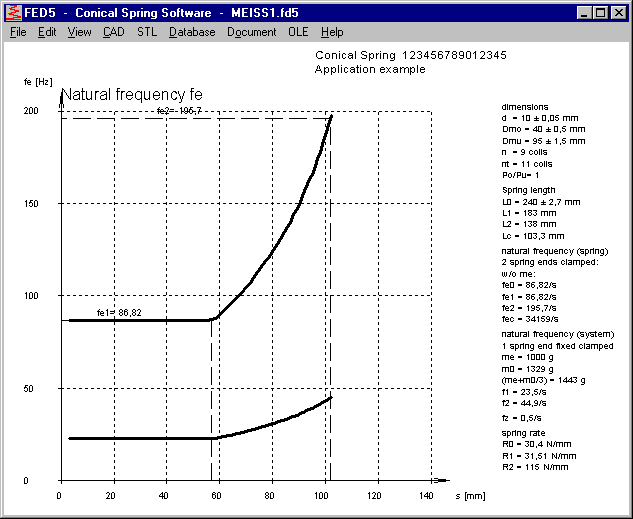 Same as in FED1+, you can input an external mass at FED5 and FED6 now to calculate natural frequency of the spring-mass-system. If spring length L2 is in the nonlinear zone of the load curve, the spring-mass system has no constant resonance frequency, because spring rate changes with spring deflection. This is an advantage of nonlinear springs. FED5 and FED6 calculate then the natural frequency of the spring-mass-system at L1 and L2.