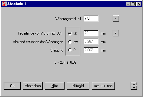 FED7: Eingabe L0 oder aw oder P und Dm, Di, De bei Windungsabschnitten
