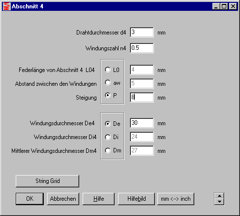 Die Eingabe der Windungsabschnitte bei FED7 wurde flexibler: Alternativ zur Länge eines Federabschnitts L0i kann man den Windungsabstand aWi oder die Steigung Pi eingeben. Und alternativ zum mittleren Windungsdurchmesser kann nun auch äußerer oder innerer Windungsdurchmesser eingegeben werden. Die Einstellung hat auch Auswirkung auf die Fertigungszeichnung: nur der zuletzt gewählte Wert wird in der Tabelle ausgegeben.