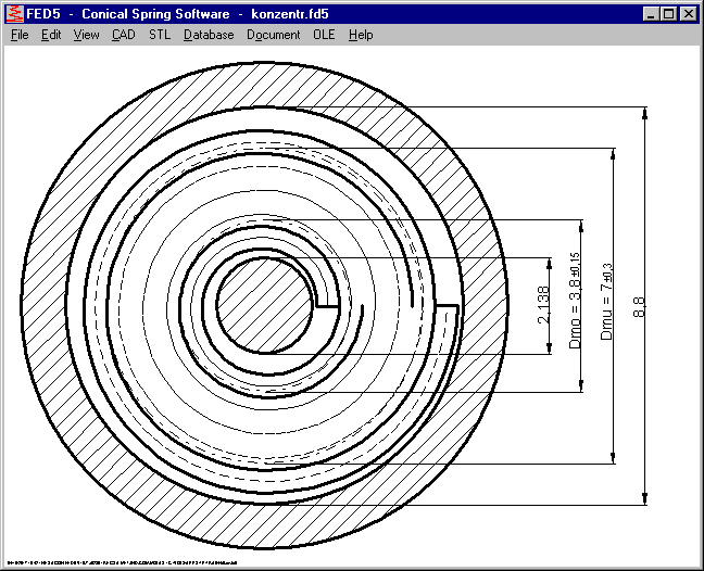 In der neuen Draufsicht kann man die Führung der Kegelfeder in Dorn und Hülse beurteilen, vor allem auch bei koaxialen Endwindungen. Eingezeichnet werden Aufnahmedorn und Hülse sowie die Endwindungen der Kegelfeder. Von den aktiven Windungen wird nur die Mittellinie (als Spirale) eingezeichnet.