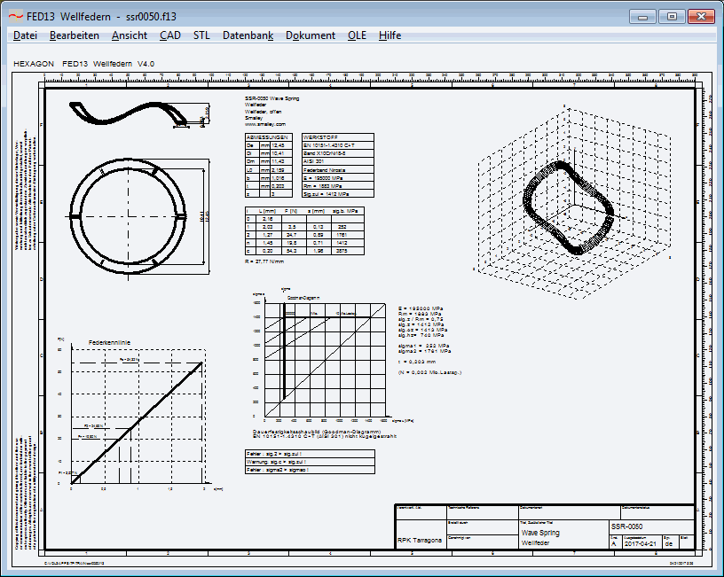 Die Quick4-Ansicht enthält Wellfederdaten, Zeichnungen, Federkennlinie und Goodman-Diagramm in einem A3-Zeichnungsrahmen.