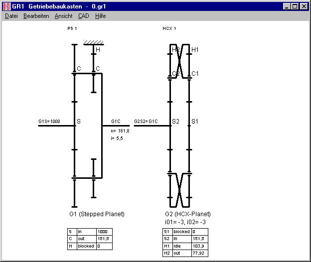 Mit der Getriebebaukasten-Software GR1 kann man jetzt auch Stufenplaneten sowie Planetenradpaare verbauen, bei denen Hohlrad und Carrier kreuzweise verbunden sind (deshalb HCX-Planetenpaar).
