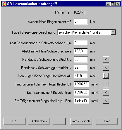 Mit dem Vorschlagsbutton "<" bei "AD" wird jetzt die Trennfugenfläche aus kleinstem Außendurchmesser und größtem Innendurchmesser der beiden an der Trennfuge beteiligten Klemmplatten berechnet. Für den Verbesserungsvorschlag bedanke ich mich bei Herrn Lederer von Vossloh Locomotives.