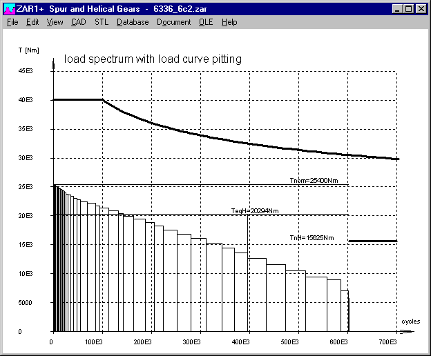 Limits of the y axis (torque) has been changed, so that S/N curve can be drawn in any case. Equivalent S/N curve of the load spectrum is no longer drawn nor the corresponding parameters TnFeq, TnHeq, T0Feq and T0Heq, as not mentioned in ISO 6336-6. Scale of the x axis (cycles) can be drawn linear or logarithmic. Program calculates torque for safety factors SH=1 and SF=1 in an iteration, as well as static safety SHplast and SFplast for the highest (1st) torque of the load spectrum.