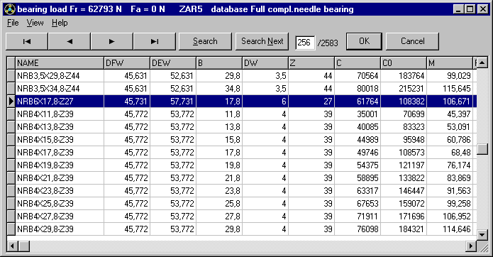For full compl. needle bearings, clearance between rollers is calculated by the program (pitch diameter clearance TES = 5E-3 Z according to Schaeffler). Then roller race diameter of shaft and bore can be calculated. To select full compl.needle bearings as known from other roller bearing databases, a new database file was created for pin diameters of 1mm until 6mm and pin length of 5.8mm until 39.8mm and 10 until 50 pins, with calculated race diameters, rated load C and C0 and mass. This results in a new database file with 2500 records.