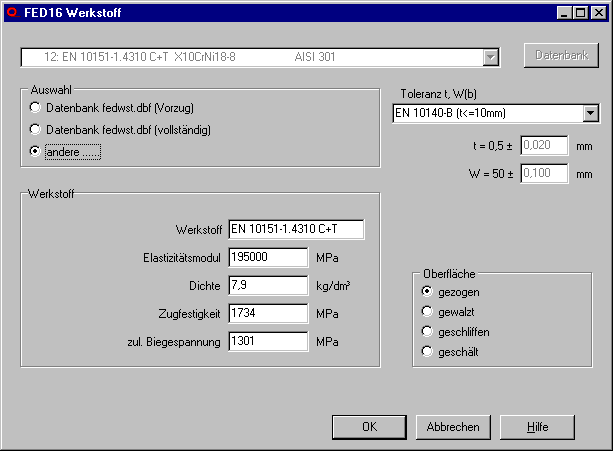In der Werkstoffdatenbank wurden die Dauerfestigkeitswerte ergänzt, so daß nunmehr auch Smith-Diagramm, Haigh-Diagramm, Goodman-Diagramm und Wöhlerkurve angezeigt werden. Die Daten wurden von EN 13906-1 und den Federprogrammen übernommen.