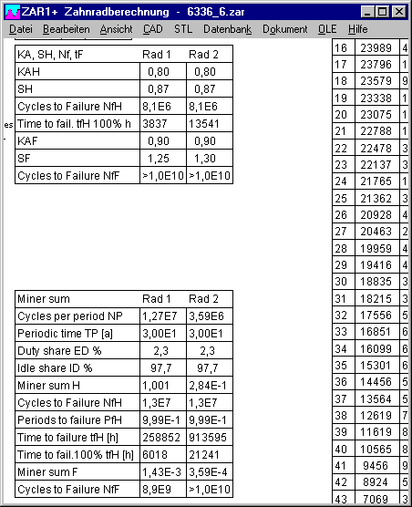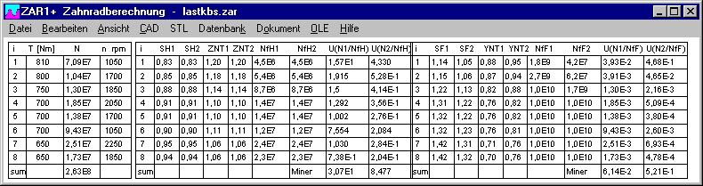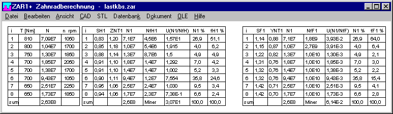 Da die Miner-Summen für 4 verschiedene Schädigungstypen (Zahnfußdauerbruch und Pitting für Rad 1 und Rad 2 berechnet werden müssen, gibt es eine Vielzahl von Daten, die in insgesamt 3 Tabellen dargestellt werden können.