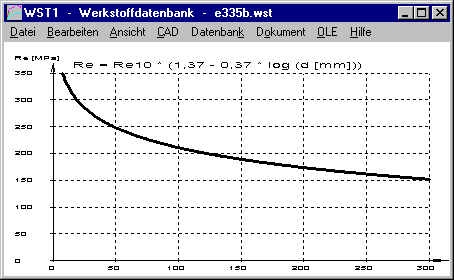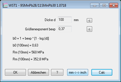 In WST1 war es bislang so, daß für alle Stähle der Werkstoffgruppe 1 bis 27 ein Größenfaktor b0=1+0.2*[1-log(d)] für die Berechnung der Spannungen verwendet wurde, wenn eine Materialdicke <> 10mm eingegeben wurde. Die Werkstoffdaten aus den Datenbanken beziehen sich auf 10 mm Dicke. Weil der Größeneinfluß je nach Werkstoff und Wärmebehandlung unterschiedlich sein kann, gibt es jetzt die Möglichkeit, den Exponenten für die Berechnung des Größenfaktors selber einzugeben. Zunächst muss man ankreuzen, daß ein Größenfaktor berücksichtigt werden soll. Wenn die Grenzspannungen unabhängig von der Materialdicke gelten, ist der Größenexponent bexp=0. Für Stähle gilt meist ein Größenexponent zwischen 0.1 und 0.4.