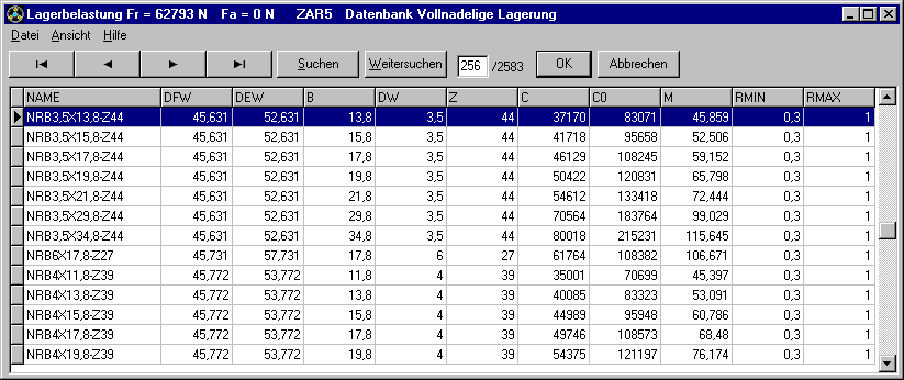 Für vollnadelige Lagerung wird das Spiel zwischen den Rollen (Teilkreisendspiel TES = 5E-3 Z) vom Programm berechnet (nach Schaeffler). Daraus ergibt sich dann der Laufbahndurchmesser von Welle und Bohrung bzw. von Planetenbolzen und Planetenrad. Um die Wälzlager wie gewohnt aus Datenbank wählen zu können, wurden für Wälzrollen von 1mm bis 6mm mit Breiten von 5.8mm bis 39.8mm und 10 bis 50 Wälzkörpern die Laufbahndurchmesser, Tragzahlen C und C0 und Masse berechnet. Das ergibt dann eine Datenbank mit 2500 Datensätzen.