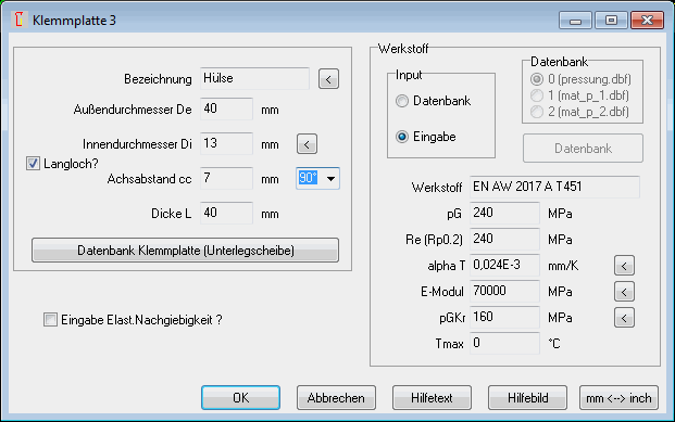 Die Fläche des Langlochs wird bei der Berechnung der Flächenpressung (Sicherheit Sp und SpKr) berücksichtigt. Für den Verformungskegel wird aus der ovalen Fläche ein Ersatzdurchmesser berechnet.