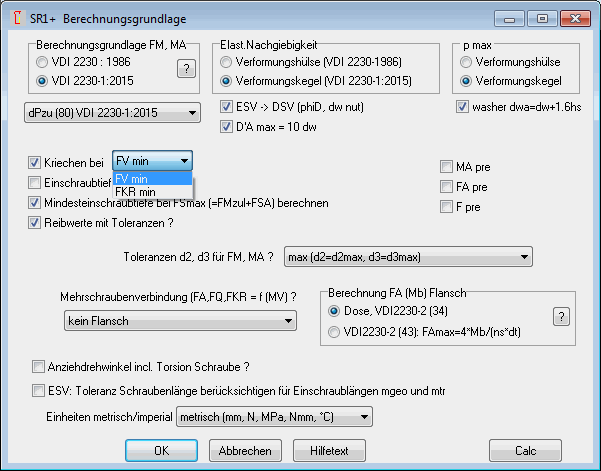 Bislang war der Kriechnachweis Spkr mit der Restklemmkraft FKRmin berechnet worden. Bei SpKr=1 war damit Kriechen bis zur Restklemmkraft FKRmin zulässig. Sicherer ist es jedoch, statt FKRmin nur Kriechen bis zur Mindestvorspannkraft FVmin zuzulassen. Ob die Sicherheit SpKr mit FKRmin oder FVmin berechnet wird, kann man jetzt konfigurieren. Voreinstellung ist FVmin.