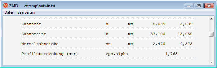 Für ZI-Schnecken wird die Profilüberdeckung epsilon alpha im Normalschnitt in Radmitte mit ausgedruckt unter Ausdruck\Abmessungen.