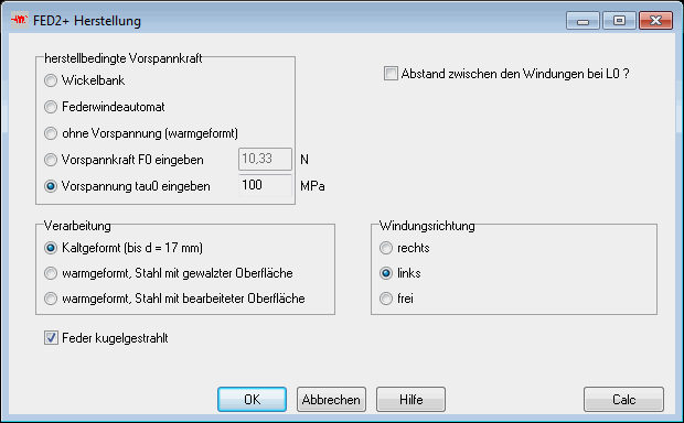 Die eingewundene Vorspannkraft F0 kann man aus den Vorschlagswerten nach EN 13906 bei Herstellung mit Wickelbank oder Federwindeautomat berechnen, auf 0 setzen (bei Windungsabstand oder warmgeformten Federn) oder F0 direkt eingeben. Zusätzlich kann man jetzt auch noch alternativ die Vorspannung tau0 eingeben.
