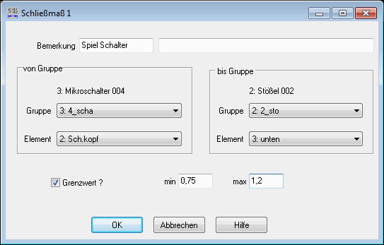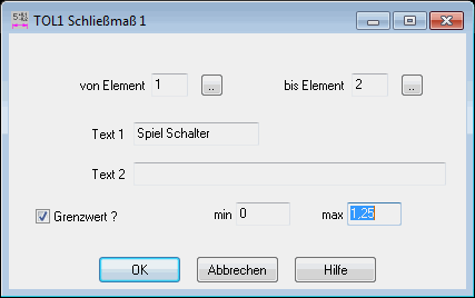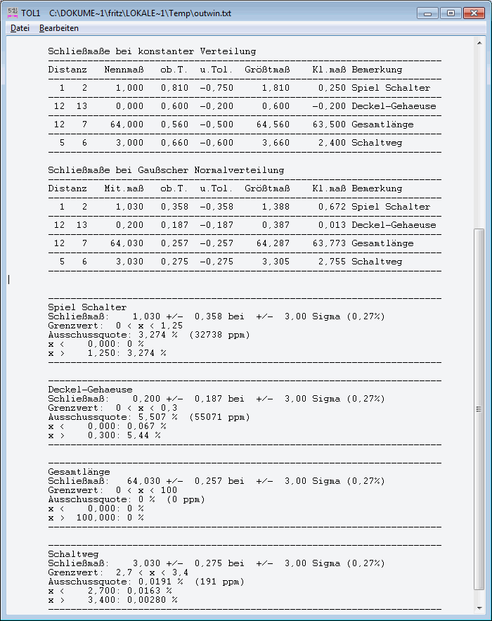 Zu den Schließmaßen kann man jetzt noch zusätzlich Grenzmaße (min/max) eingeben. TOL1 berechnet dann die Ausschußquote der Maße, welche außerhalb der Grenzmaße liegen.