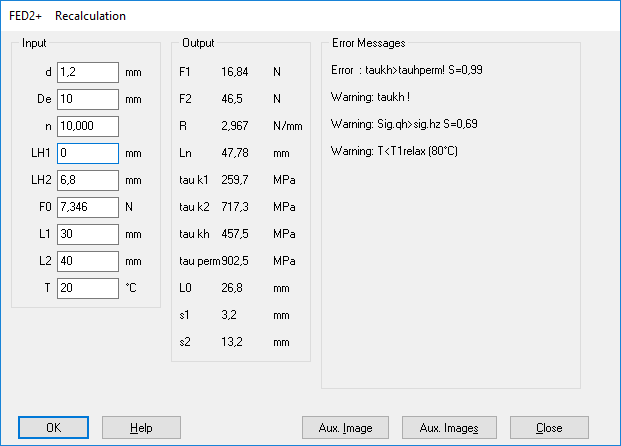 In FED2 + there are also several special methods for dimensioning and recalculation of tension springs (online input). Under "Edit\Dimension" and "Edit\Recalculation" a suitable loop height (depending on the selected loop) is now suggested when you input LH1=0 or LH2=0.