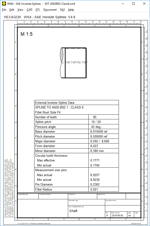 So far, a drawing of the calculated machine element has been fitted in an A4 sheet in maximum size. Now the drawing is inserted in the next smaller standard scale 1:1, 1:2, 1:5, 2:1, 5:1 etc.