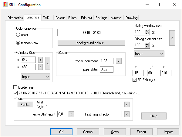 When large fonts or special dialog boxes are configured on Windows, the dialog boxes may be too large or too small. Then you have to configure "File\Settings\Graphics" "dialog window size" and appropriately "dialog element size". Default setting is 100% (first select "Input"). In previous versions you could drag the dialog box even bigger or smaller, but in newer versions there were mostly no scroll bars. So you had to configure the dialog window size correctly first. This change has now been reversed, so that even if the configuration is incorrect, you are not forced to cancel the calculation and to configure the dialog boxes first.