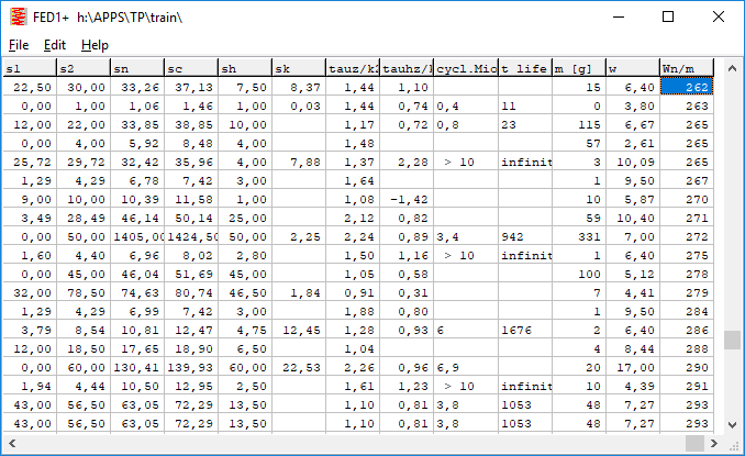 Bei den Federprogrammen wird ein neuer Vergleichsfaktor eingeführt: Energie-Masse-Ratio (W0n/m) als Meßgröße, wieviel Energie man mit 1 kg Material dieser Feder speichern kann. Damit kann man verschiedene Federtypen, Werkstoffe, Querschnittsformen vergleichen. Deshalb wird "Wn/m" auch in die Vergleichstabelle unter "Datei->Öffnen Tabelle" aufgenommen.