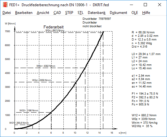 Neu angezeigt wird auch ein Energieausnutzungsgrad = W02/W0n bzw. W02/W0z als Meßgöße, wieviel Energie der maximal nutzbaren Energie der Feder für die Anwendung genutzt wird. Dabei ist zu beachten, daß der Ausnutzungsgrad nur bei statischen Anwendungen 100% sein kann, bei dauerfester dynamischer Anwendung muss der (statische) Energieausnutzungsfaktor kleiner als 100% sein. Bei allen Federn außer Schraubendruckfedern, Tellerfedern und Wellfedern ist der nutzbare Federweg sn und die nutzbare Federenergie Wn durch die zulässige Schub- oder Biegespannung begrenzt. Schraubendruckfedern werden dagegen meist blockfest ausgelegt, so daß die zulässige Schubspannung gar nicht erreicht werden kann, weil die Feder vorher auf Block läuft. Deshalb wird bei Schraubendruckfedern, Tellerfedern und Wellfedern in diesem Fall eine theoretische Federarbeit W0z berechnet, bei der Federkraft und Federweg aus der zulässigen Schubspannung bzw. zulässigen Biegespannung berechnet werden.