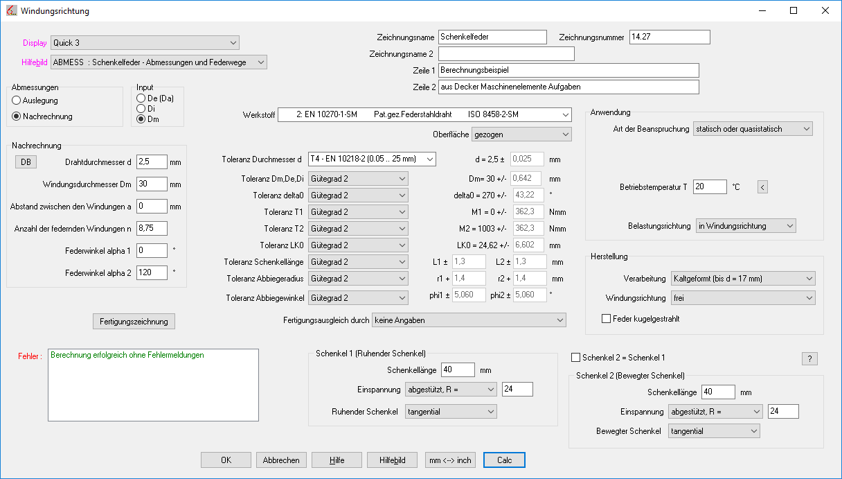 In der Quick-Eingabe wurden alle Eingabedaten in nur einem Dialogfenster zusammengefasst. Mit Calc oder Enter wird die Schenkelfeder berechnet und die Ergebnisse im Hintergrundfenster angezeigt.