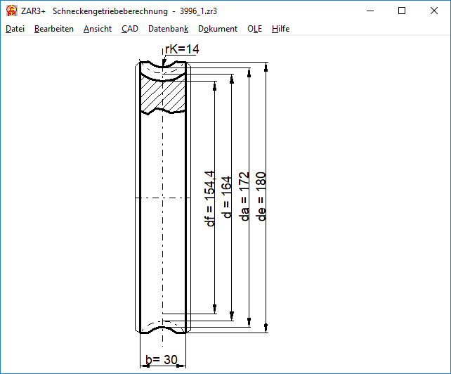 In ZAR3+ wird das Schneckenrad mit der Zahnbreite b2 gezeichnet. Meist ist die Schneckenradbreite b2R bzw. b2H größer als die Zahnbreite b2, deshalb wird jetzt in der Zeichnung eine breitere Form des Schneckenrads angedeutet. Die endgültige Ausgestaltung mit Fasen und Radien bleibt dem Konstrukteur überlassen.