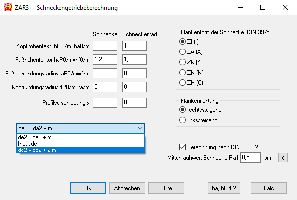 Den Außendurchmesser de2 des Schneckenrads kann man direkt eingeben oder mit "de2 = da2 + mt2" berechnen lassen. Der Tangentialmodul mt2 des Schneckenrads ist der Axialmodul mx1 der Schnecke, meist nur als Modul m bezeichnet. Jetzt kann man auch "de2 = da2 + 2 m" berechnen lassen. Da auch die empfohlene Zahnbreite b2 des Schneckenrads auf de2=da2+2m basiert, ist dies die neue Standardeinstellung.