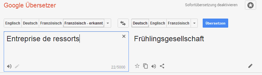 Google Translator Blossoms: "Entreprise de Ressort" is a "Frühlingsgesellschaft"