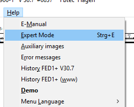 In FED1+, almost all input data was integrated in the Quick Input. Nevertheless, the individual entries still exist in the menu because of the preference of many users. In order to make the menu easier for beginners, you can now switch off the expert mode under "Help -> Expert Mode", then in "Edit" there are only 5 menu items left (instead of 18). Also, Database, OLE, and some positions in the File menu are no longer displayed.