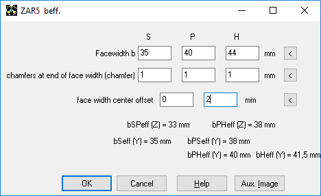 For different face width of the gear wheels, eventually combined with chamfers and center offset, effective face width used for tooth root fracture calculation (beffY) and for flank pressure calculation (beffZ) according to ISO 6336 / DIN 3990 has to be used. The effective tooth width from the input window with different tooth widths, chamfers and center offset is now correctly taken over again in the calculation of the pairs sun-planet and planet-ring gear.