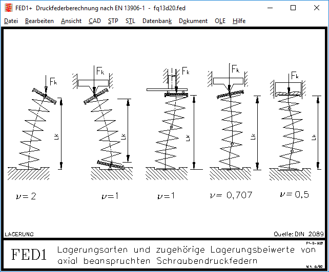 Eine Querkraft wirkt radial an einem der beiden Federenden. Deshalb muss ein Federende radial verschiebbar sein. Für diese Lagerung ist der Lagerungsbeiwert 1. Deshalb muss bei Querkraftberechnung der Lagerungsbeiwert immer auf 1 gesetzt sein.