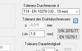Das Federprogramm berechnet die Toleranz für den Drahtdurchmesser, wenn man die Güteklasse wählt. Nun sind die verschiedenen Güteklassen im Laufe der Zeit recht zahlreich geworden, nach DIN und EN, für kalt- und warmgeformte Federn, verschiedene Klassen auch für patentiert gezogenen Draht, ölschlussvergüteten und nichtrostenden Federdraht. Wenn das Programm eine passende Güteklasse vorschlagen soll, wählen Sie den Werkstoff nicht aus der Liste, sondern klicken auf Datenbank. Werkstoff wählen, dann wird eine passende Güteklasse gesetzt: