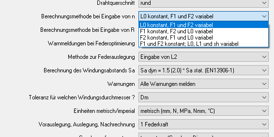 Ein Anwender hatte umgestellt auf Eingabe nur 1 Federkraft und festgestellt, daß nur die erste, voreingestellte Methode (L0 konstant) die Kräfte verändert, wenn man einen anderen Werkstoff wählt und dann Nachrechnung wählt. Bei Methode 2, 3 und 4 (mit L0 variabel) wird dagegen ungewollt die Windundungszahl angepasst, so dass die Kräfte konstant bleiben. Das passiert auch bei 2 Federkräften, wenn L1=L0 gesetzt wird. Das liegt daran, daß L1 und L2 immer konstant sind und L0 bei L0=L1 nicht gleichzeitig konstant und variabel sein kann.