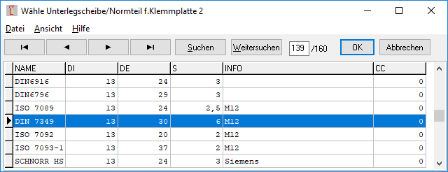 Die Klemmplatten-Datenbank KLEMMSTK.DBF mit Unterlegscheiben wurde um ein Feld CC erweitert. Das ist der Achsabstand (center-center) bei Langloch. Falls CC<>0, wird das Langloch übernommen. Falls in der Datenbank Dicke oder Außendurchmesser 0 ist, werden die Werte belassen. So kann man z.B. für ein bereits eingegebenes Klemmstück ein Langloch aus der Datenbank wählen, ohne daß deshalb Dicke und Außendurchmesser verändert werden.