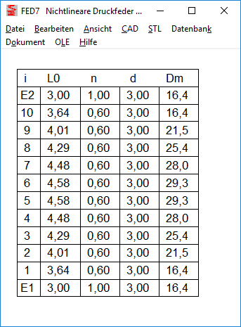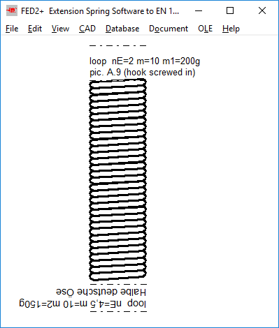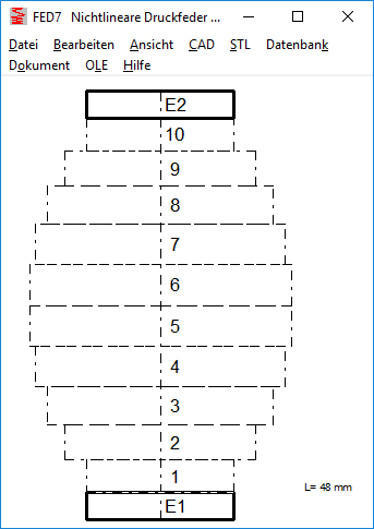 Because the spring is displayed vertically on the screen, the two spring ends are named "top" and "bottom". When entering the coil sections, you start at bottom, section 1 is the bottom section of the vertical spring. For the end coils, E1 is the lower end coil and E2 is the upper end coil. The table with the coils started with 1 (top) and ended with the last turn (bottom). Because this is reversed as in the illustrated spring drawing, the table is now shown reversed: first upper end coil E2, then starting with the last coil down to the first coil and end coil E1. Nothing changes in the production drawing, where the coil table is displayed "lying".