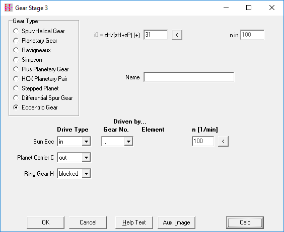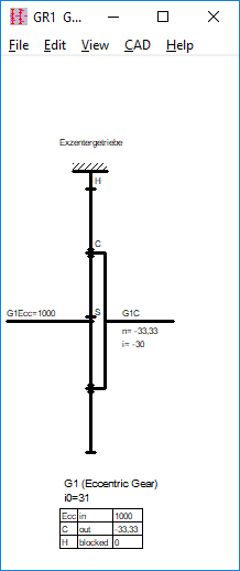 Eccentric gearboxes were added to the gearbox software GR1. The relative speeds can be calculated similarly to a planetary gear. The rolling gear wheel is the planetary gear, the eccentric shaft is the sun gear, the bolt plate is the carrier, the ring gear remains ring gear. The virtual number of teeth of the sun gear is the negative number of teeth difference: zS = zH + zP. The gear ratio with blocked carrier is i0 = zH / zS = zH / (zH + zP). The stand ratio i0 is positive, comparable with a plus planetary gear.