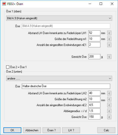 Den Abbiegeradius kann man jetzt für Öse 1 und Öse 2 getrennt eingeben. An der Berechnung der Biegespannung ändert sich dadurch nichts, entscheidend ist der kleinere der beiden Werte.