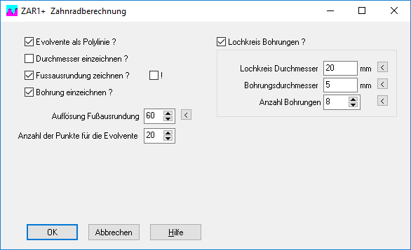Für die Herstellung von Modellgetrieben mit 3D-Drucker kann man in ZAR1+ unter "STL\Rad1,2" einen Lochkreis mit Bohrungen eingeben:
