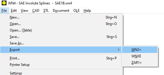 You can now export spline gears to SAE and ISO 4156 to file format WNX for WNXE, WN2 for WN2 + and ZAR for ZAR1 +. Exporting to WNXE makes sense if you e.g. want to design a splined shaft with a larger or smaller backlash for a standard splined hub. An application for export to WN2+ (only possible with the Plus version) would be a strength calculation according to DIN 5480 for a spline according to ANSI B92.1 or ISO 4156. And in ZAR1+ you can export the dimensions to see how a splined shaft is designed as spur gear.