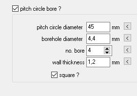 The ring gear of planetary gears can now also be printed with a square outer contour. The rim diameter dB is then the edge length a. As with a round outer diameter, fastening holes can be defined on a bolt circle. The number of holes is always 4 in this case, the hole circle diameter can be larger and dB smaller than with a cylindrical ring gear.