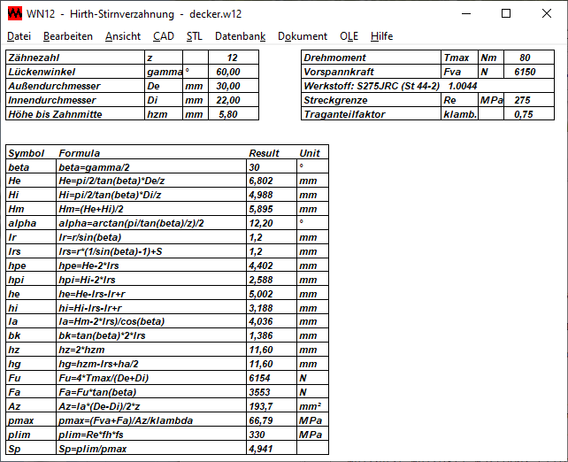 Ansicht\Berechnung: Für die innere Zahnhöhe hi wird jetzt der richtige Wert angezeigt. Der Anzeigefehler war nur in der Grafik mit den Berechnungsformeln; in Ausdruck, Fertigungszeichnung und Quick-Ansichten war "hi" richtig angezeigt.