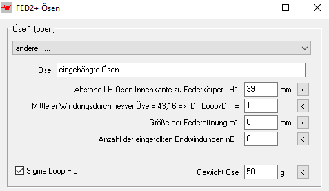 Bei der Wahl der Öse kann man "andere.." wählen, wenn keine Öse nach EN Norm verwendet wird. Bisher war auch für diese Ösen die Ösenspannung berechnet worden. Wenn es jedoch eingerollte oder eingeschraubte Ösen sind, ist die Biegespannung am Ösenübergang nicht zu berücksichtigen. Dafür kann man jetzt "SigmaLoop = 0 ?" ankreuzen. Auch für eingehängte Ösen (z.B. HiSo-Feder von Hirsch-Federn) ist die Ösenspannung wegen der 2-fach Lagerung relativ geringer als die Torsionsspannung im Federkörper.